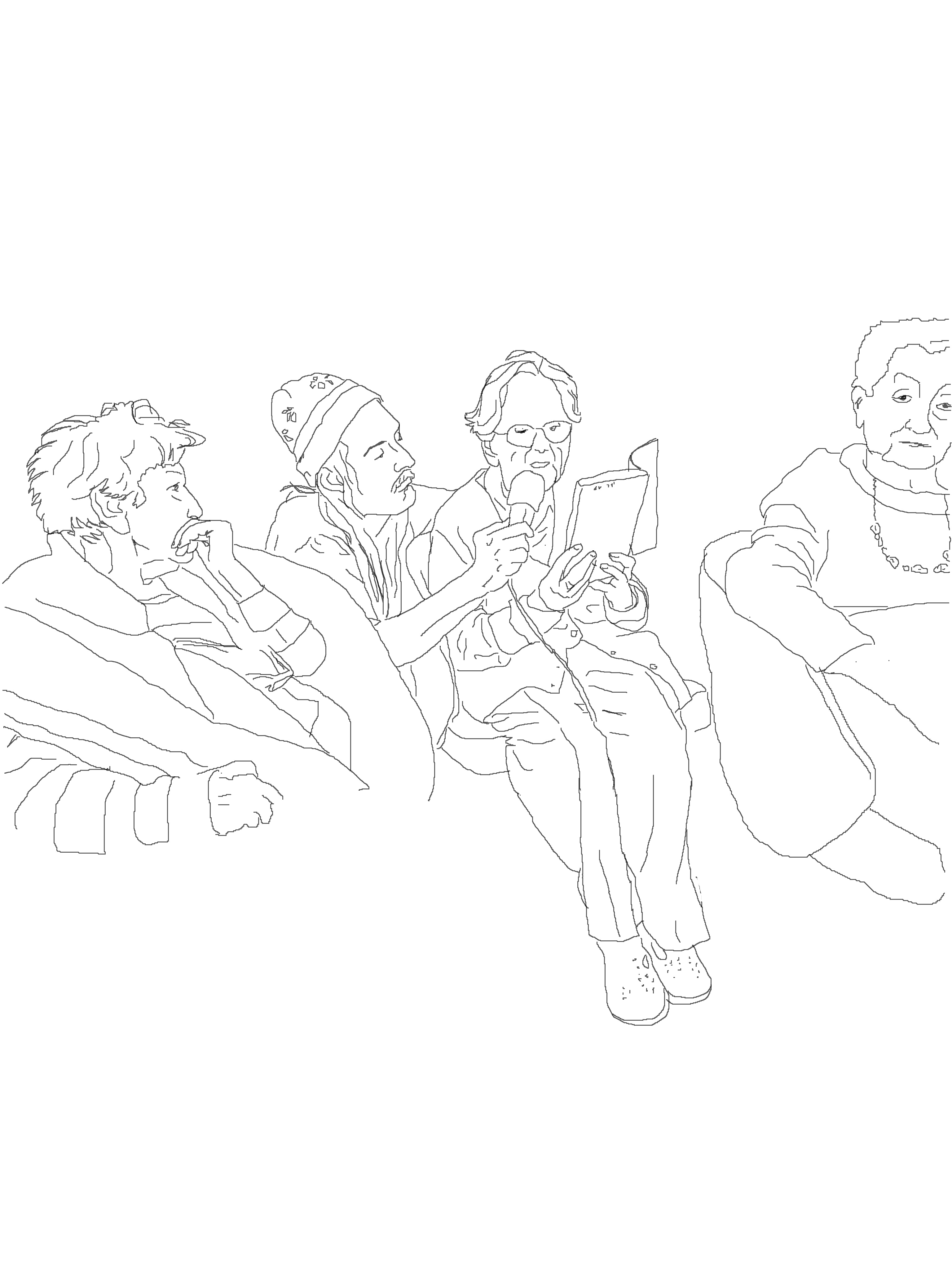 14h, le groupe, en manteau fermé, écharpe, est prêt à partir. Lazlo, Martin, Clotilde, Jackie, Marie-Claude, Huguette, Jeanne-Marie, Nelly, Michel, Claire. Le départ est prévu dans une demi-heure, on se désemmitouffle en attendant Ana et Italo qui cherchent une place. De toute façon, il faut le temps de récupérer des cale-pieds pour les cinq fauteuils (« c’est comme les chaussettes et les petites cuillères », dit quelqu’un). Huguette et Jeanne-Marie ne veulent pas venir, Irène veut attendre sa nièce qui a eu un empêchement. Huguette dit qu’il faut la prévenir en avance, qu’elle puisse s’organiser pour faire ces courses, revenir à temps pour se préparer. Frédéric dit « la prochaine fois. »