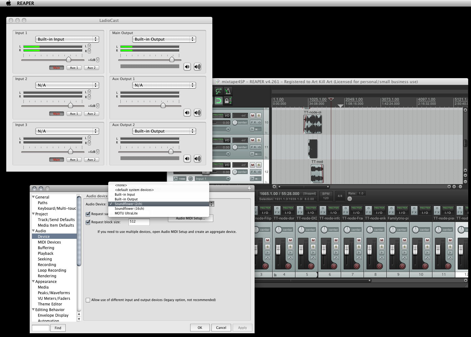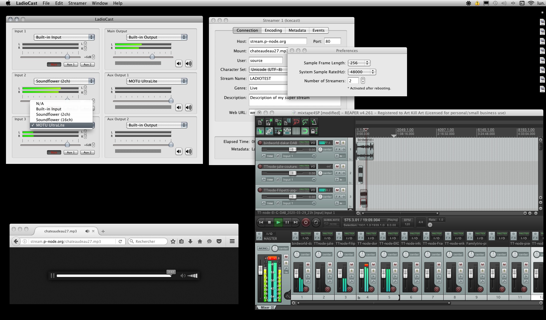 Each software will need a bit of adjusting the routing between the sound preferences, soundflower options and Ladiocast. The sound softwares such as Reaper, Ableton Live and co will be easy, but Firefox and VLC will need a bit of more tests and experiements.
