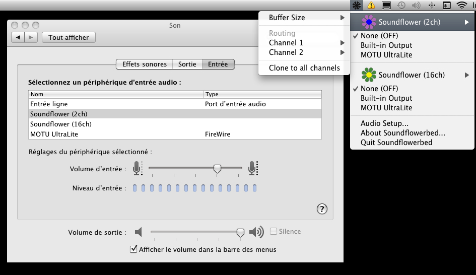 here a screenshot of the system sound preferences and soundflower menu.