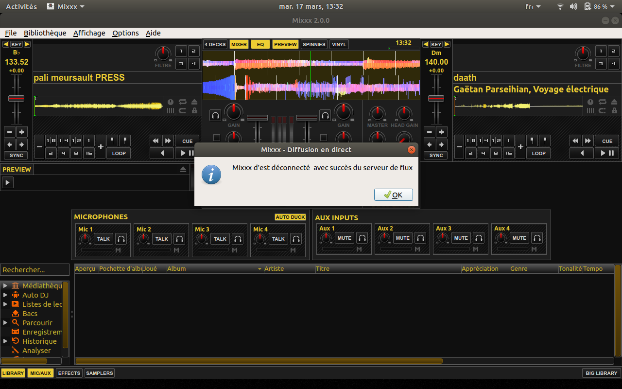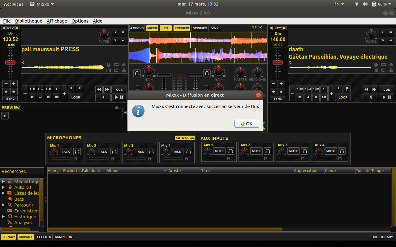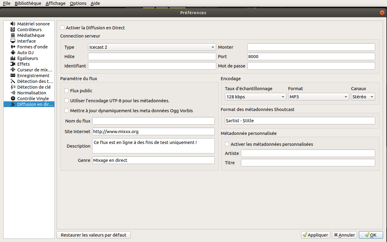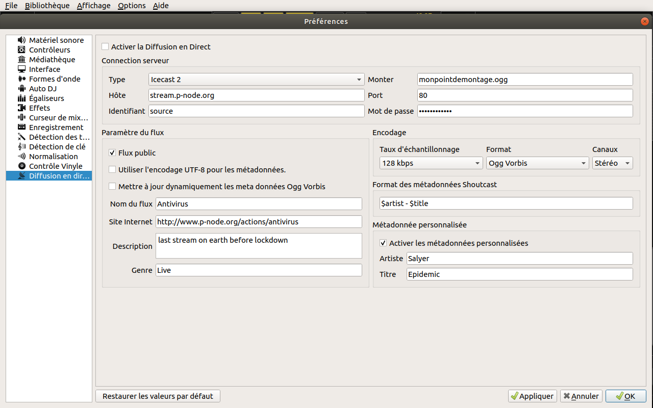 So now, the stream shall be on, open the url of your stream in a browser, to verifiy it is working. Maybe better to do it on a different machine, like a telephone, as Mixxx can monopolise your sound card.